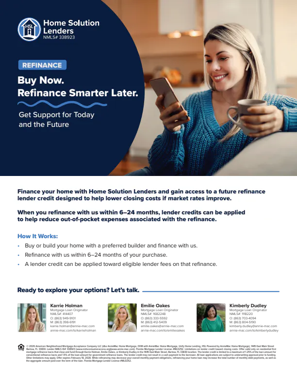 3. If rates drop, refinance! The Refinance Smarter program offered by Home Solutions Lenders means you can buy your dream home now, and if rates drop in the next 6 to 24 months, Home Solutions Lenders will help you refinance your mortgage and provide you with a lender credit to reduce refinance fees.
