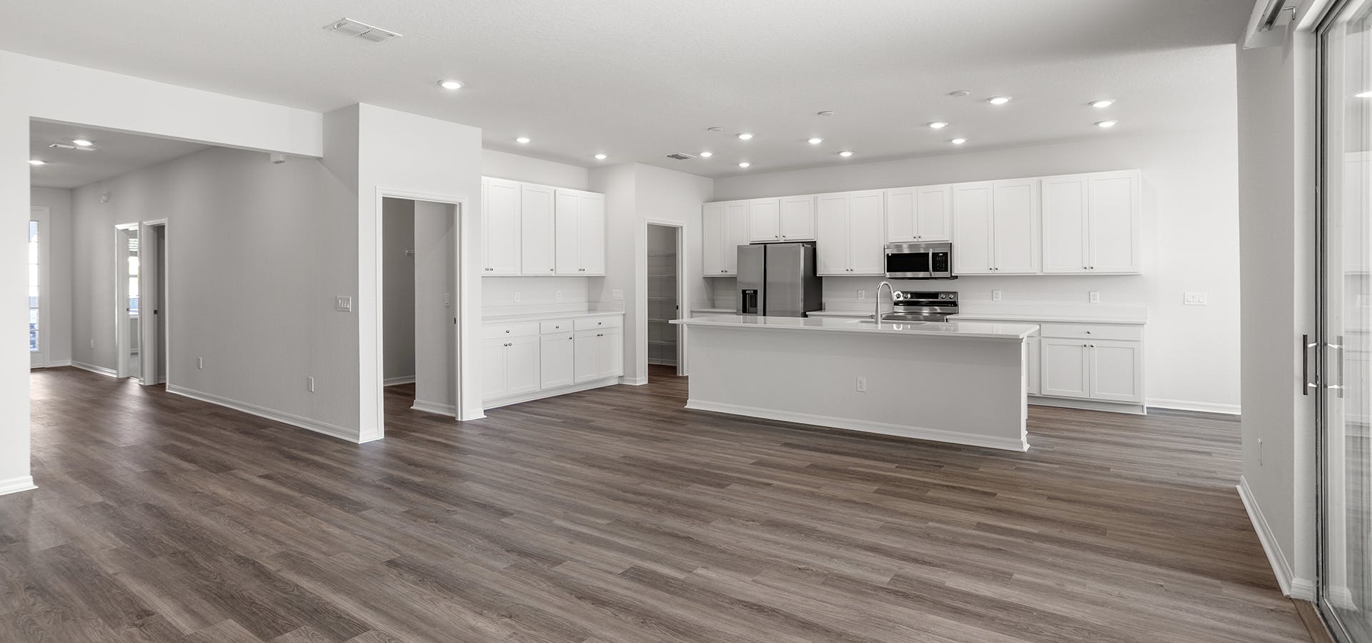 - A spacious, open kitchen with a large counter-height island, walk-in pantry, and adjacent sunny dining cafe