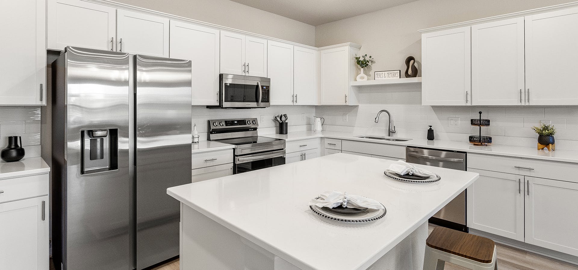 - An open kitchen with a counter-height island, pantry, and beautiful finishes