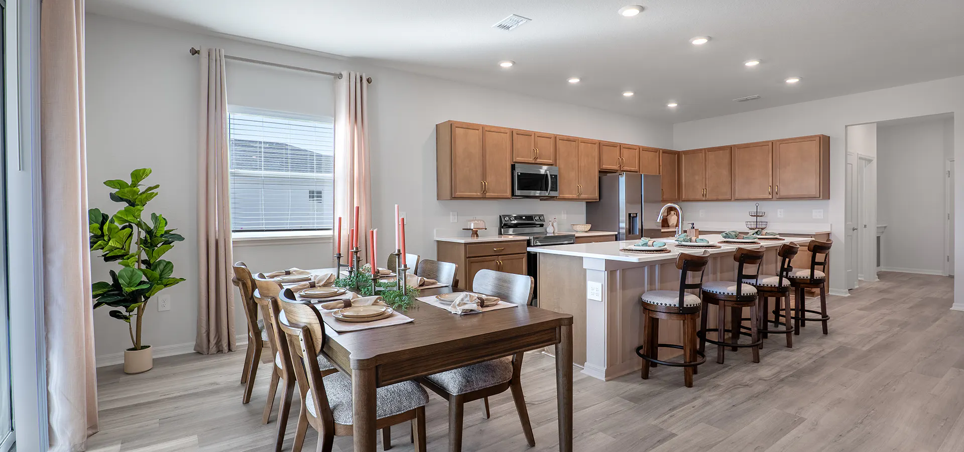 - A sunny, open kitchen with a counter-height island, walk-in pantry, and sunny dining cafe