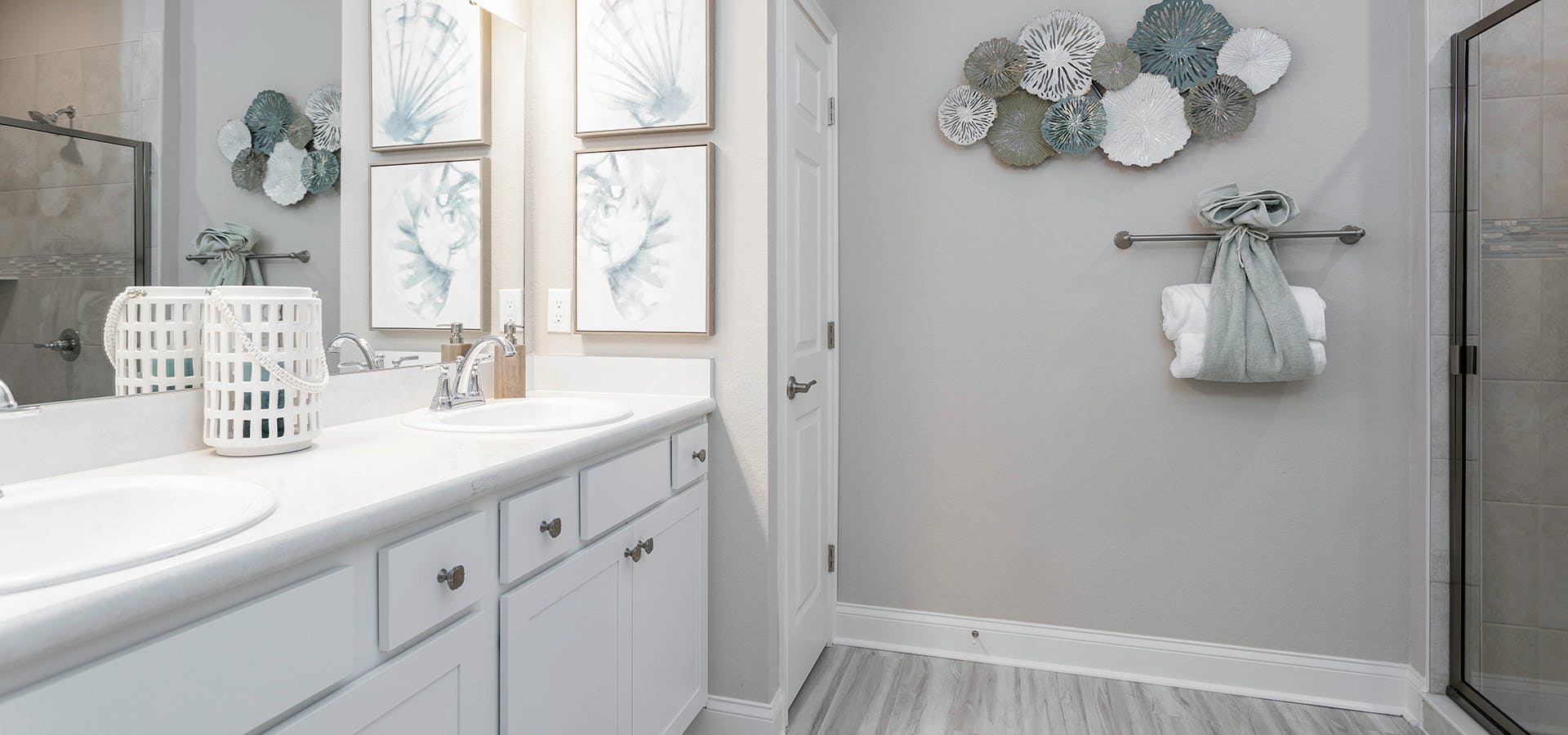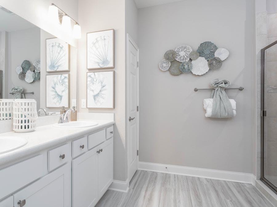 - Jack-and-Jill bath with dual vanities, a linen closet, and a private tub and toilet, with access from bedrooms 3 and 4