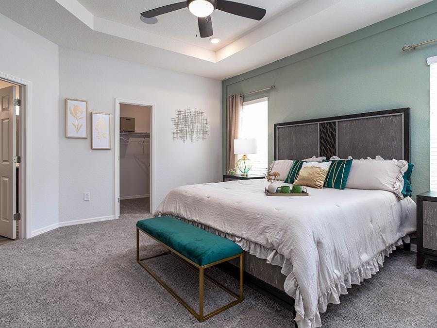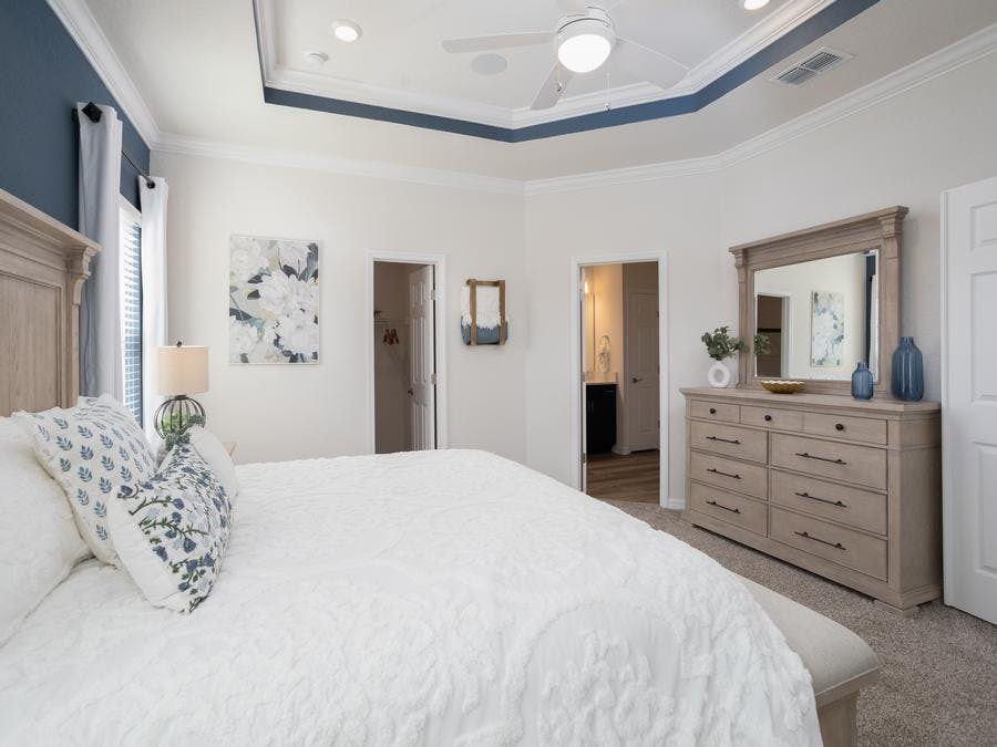 - A spacious owner's suite with a grand double-door entry, elegant tray ceiling, walk-in wardrobe, and dual-vanity en-suite bath with a tiled shower, linen closet, and closeted toilet