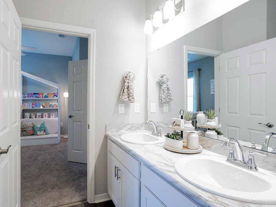 - Jack-and-Jill bath with dual vanities, a linen closet, and a private tub and toilet, with access from bedrooms 3 and 4