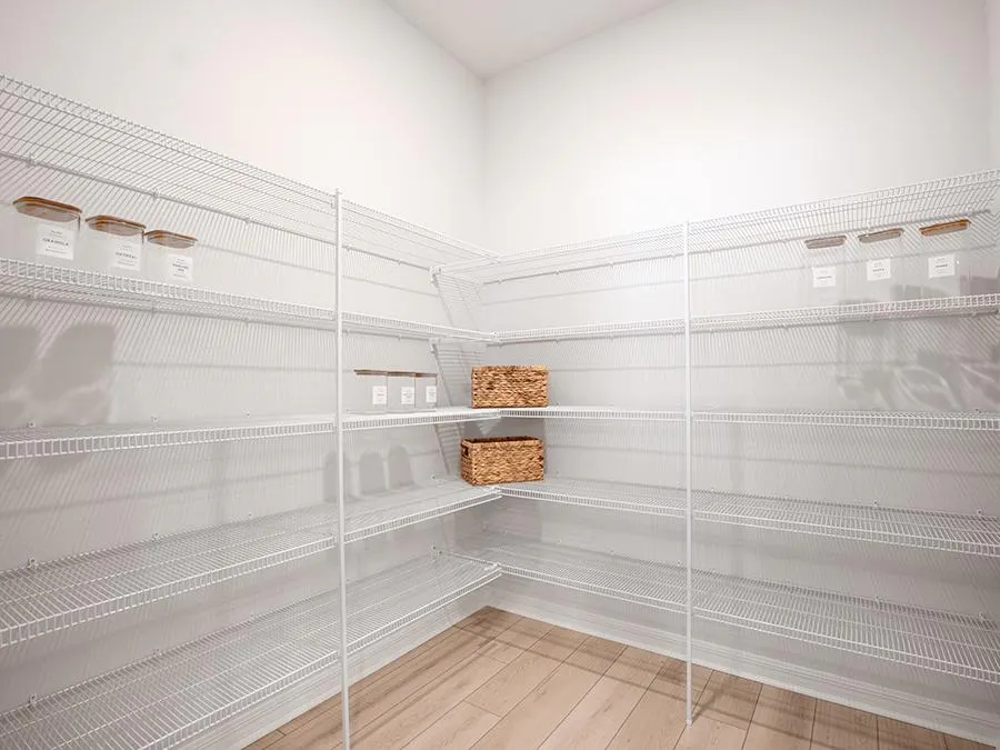 - A sunny kitchen with a large counter-height island, walk-in pantry, and adjacent dining cafe