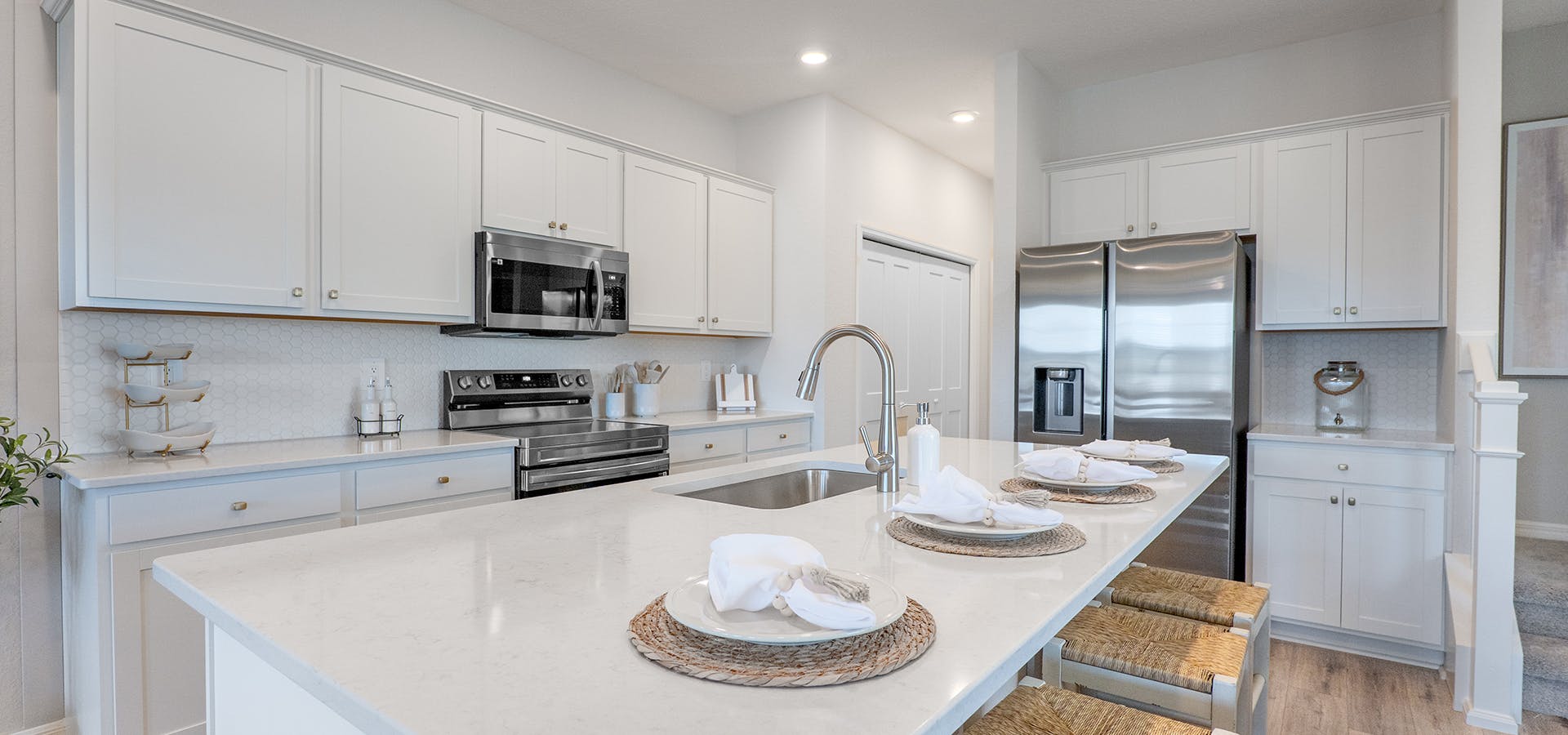 Bungalows at Estates at Hickory Cove offer 1,900+ square feet of living space with 3 or 4 bedrooms, beautiful curb appeal including a front porch and Craftsman-style exterior design, and an attached 2-car garage located on the rear of the home with alley access. Inside, you'll find open-concept living space, a private owner's suite, and flexible-use rooms, with features and finishes hand-selected by our professional designers for your lifestyle and move-in convenience.