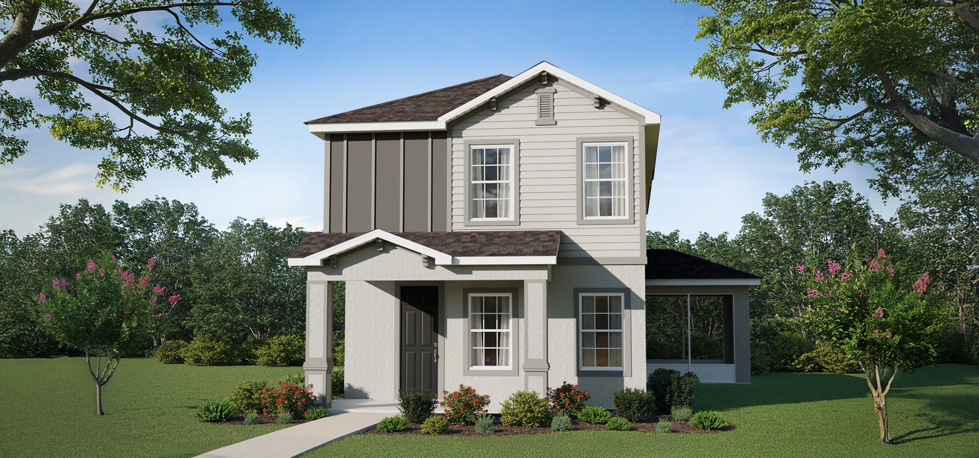 Upstairs, a flex-use loft is at the stairway landing. Relax in your spacious owner's suite with a large walk-in wardrobe, linen closet, and private en-suite bathroom including dual vanities, quartz counters, a decorative tiled shower with glass enclosure, and a private toilet. Two secondary bedrooms with walk-in wardrobes share a Jack-and-Jill bath with private vanities for each bedroom. Plus, enjoy outdoor living on your front porch and screened lanai!