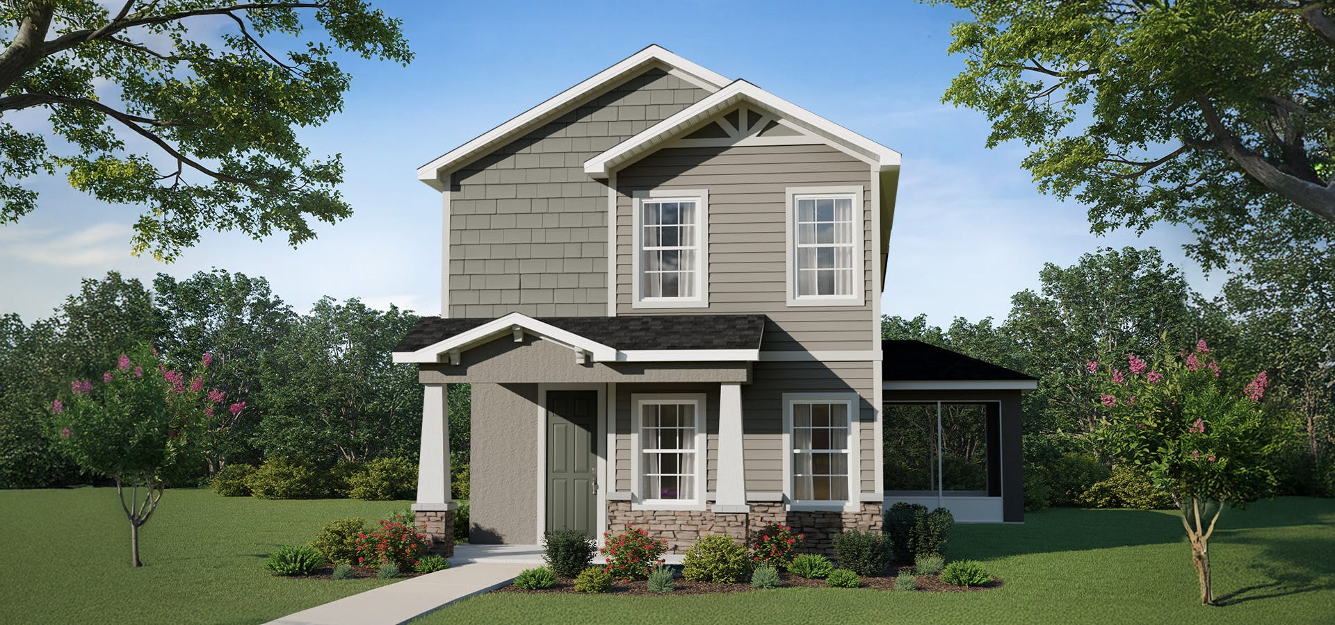 Upstairs, a flex-use loft is at the stairway landing. Relax in your spacious owner's suite with a large walk-in wardrobe, linen closet, and private en-suite bathroom including dual vanities, quartz counters, a decorative tiled shower with glass enclosure, and a private toilet. Two secondary bedrooms with walk-in wardrobes share a Jack-and-Jill bath with private vanities for each bedroom. Plus, enjoy outdoor living on your front porch and screened lanai!