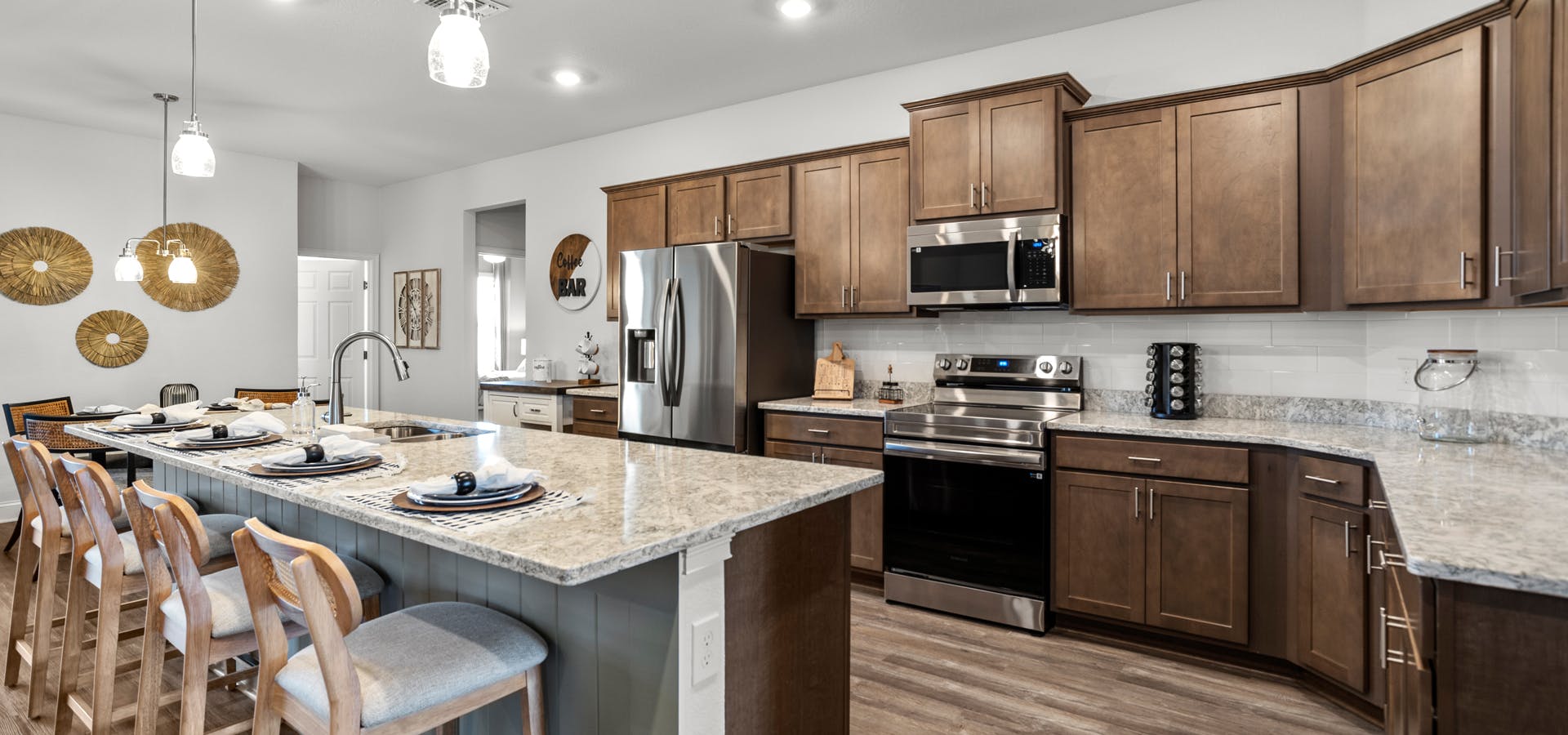 - Upscale kitchen with granite or quartz, Samsung SS appliances, and 36-in. staggered cabinets