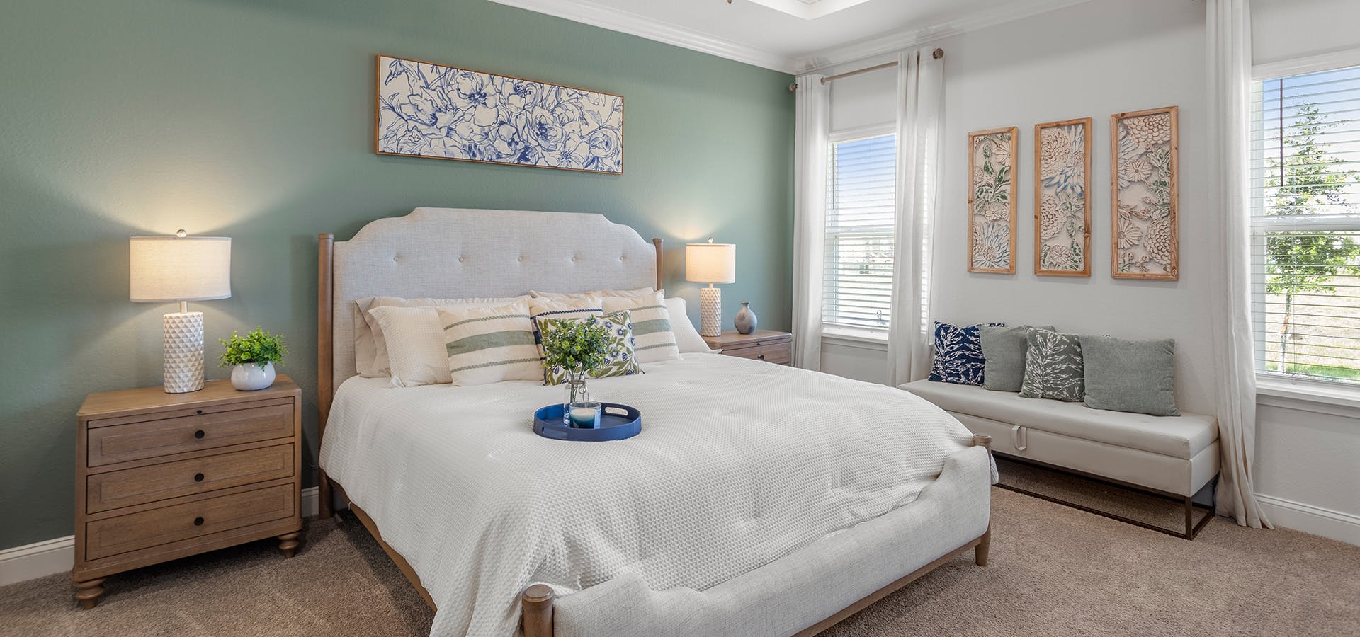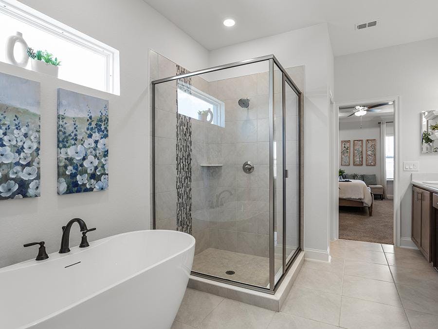 - Spacious en-suite owner's bath with dual vanities, a tiled shower, and garden or freestanding tub (per plan)