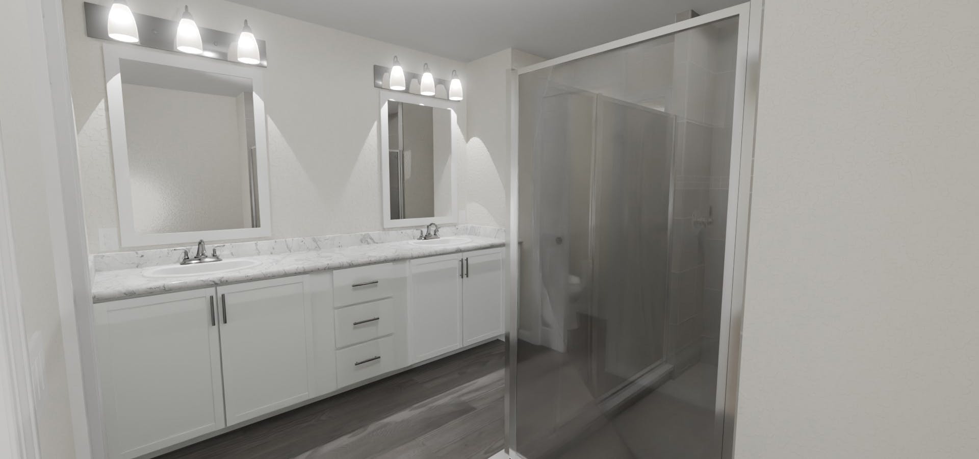 - A spacious owner's suite with a large walk-in wardrobe and a private en-suite bath with dual vanities, a glass-enclosed tiled shower, a linen closet, and a closeted toilet