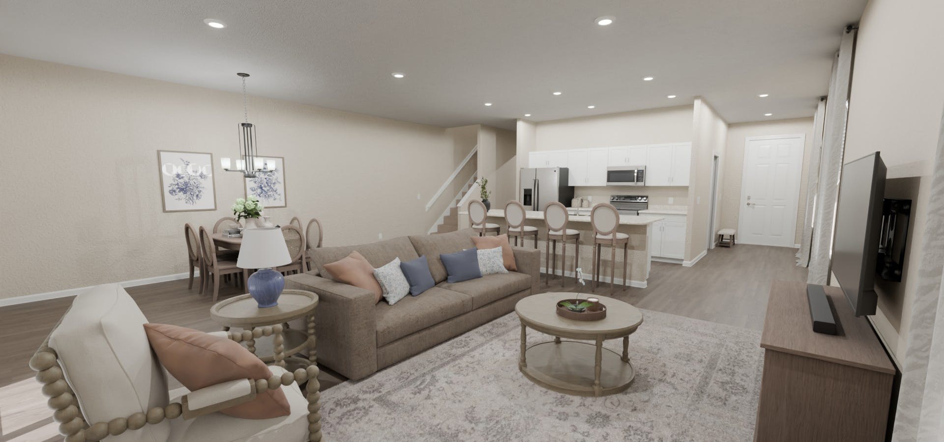 - A spacious gathering room with an integrated dining room