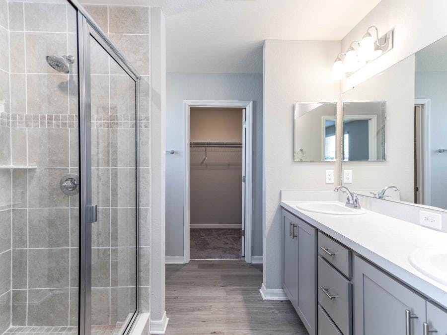 - A large owner's suite with a walk-in wardrobe and a private en-suite bath with dual vanities, a tiled shower, and a linen closet