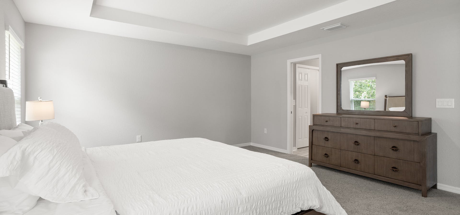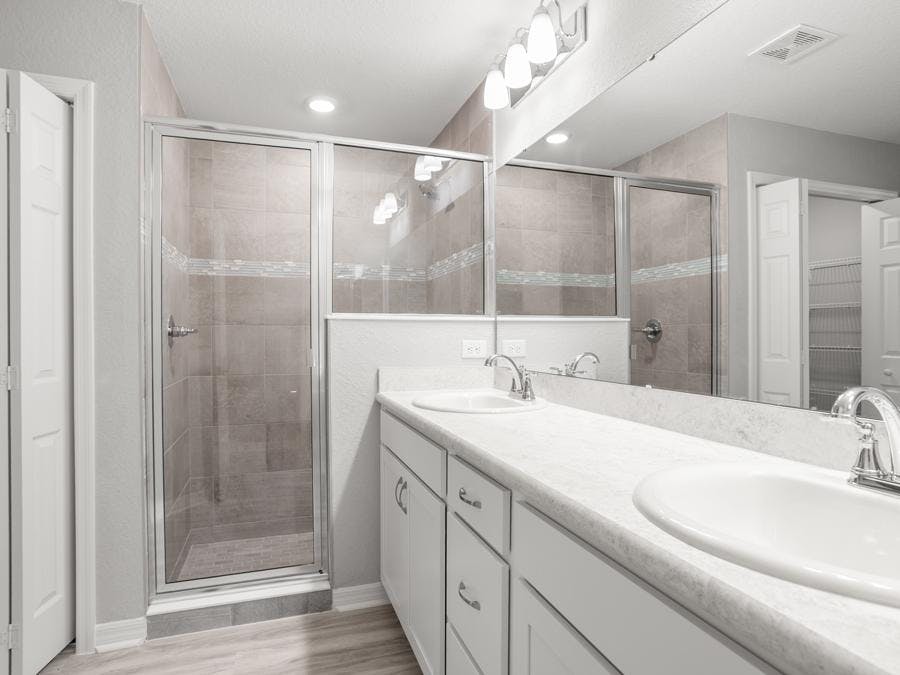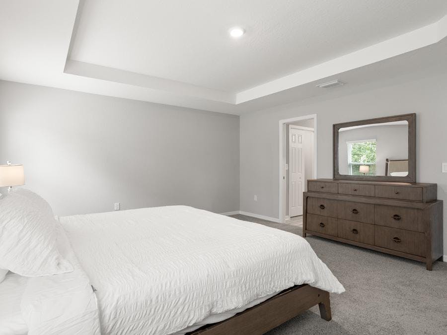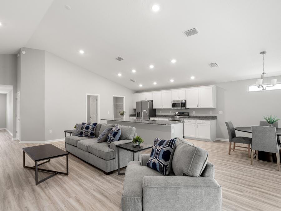 This beautiful home features an open living area with luxury vinyl plank flooring under volume ceilings, opening to outdoor living space on your large covered lanai! Relax in your luxurious owner's suite complete with an elegant tray ceiling, two walk-in wardrobes, and a spacious en-suite bath with dual vanities, a decorative tiled shower with glass enclosure, and a closeted toilet.